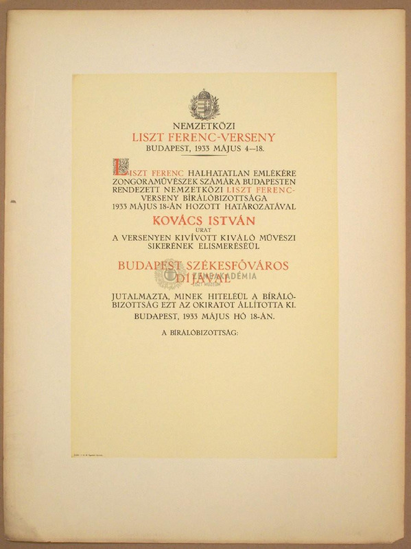- Díszoklevél a Budapest Székesfőváros díjával jutalmazott Kovács István részére az 1933-as Nemzetközi Liszt Zongoraversenyről.