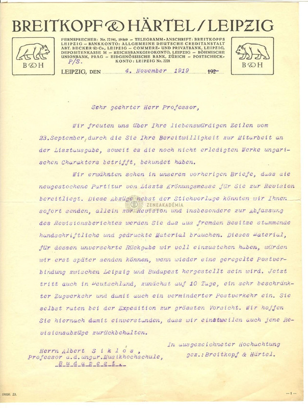 A Breitkopf és Härtel cég levele Siklós Albertnak, a Zeneakadémia professzorának, aki elvállalta a "Koronázási mise" revízióját. A művet csak később tudják küldeni, amikor helyreállították a postahálózatot Lipcse és Budapest között.