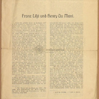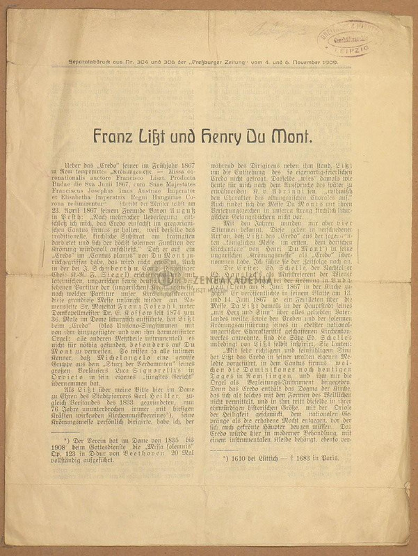 A Breitkopf és Härtel cég mellékelte Siklós Albertnak, a Zeneakadémia professzorának a "Koronázási mise" revíziójával kapcsolatban. J. Batka újságcikke "Franz Liszt und Henry du Mont" címmel.