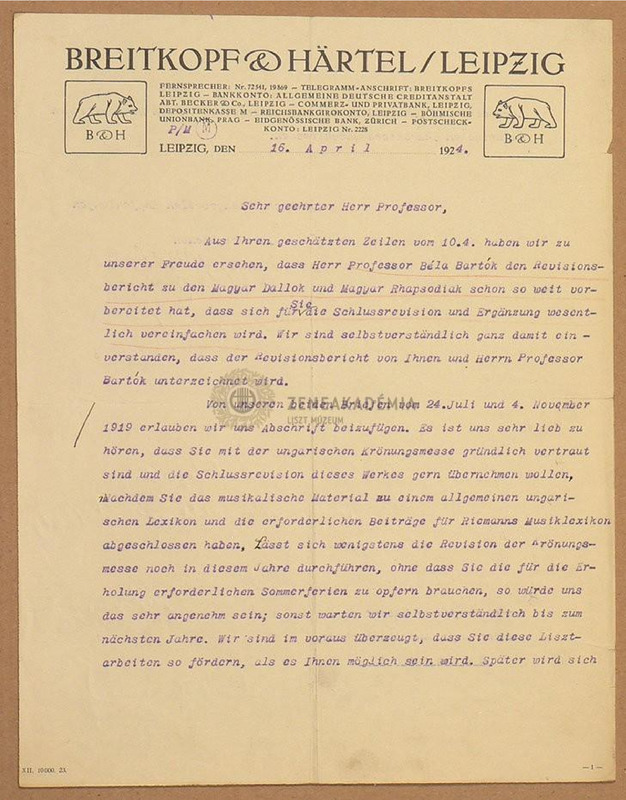 A Breitkopf és Härtel cég levele Siklós Albertnak,a Zeneakadémia professzorának a Liszt-összkiadás "Magyar Dallok" és "Magyar rapszódiák" végső revíziójával kapcsolatban, melyek előkészítésén Bartók Béla dolgozott.A kiadó beleegyezik, hogy a munka mindkettejük nevével jelenjen meg.