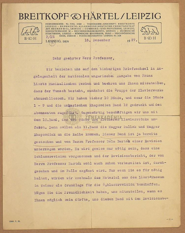 A Breitkopf és Härtel cég levele Siklós Albertnak,a Zeneakadémia professzorának, melyben a Liszt-összkiadás "Magyar Dallok" és "Magyar rapszódiák" végső revíziójának befejezését sürgetik a kritikai megjegyzésekkel.