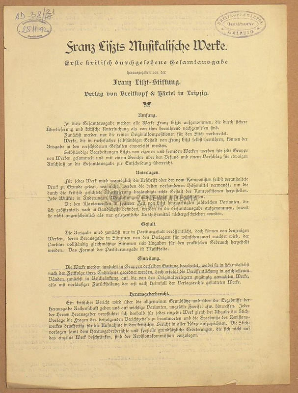 A Breitkopf és Härtel cég első, kritikai Liszt-összkiadásának ismertető leírása, német nyelven.
