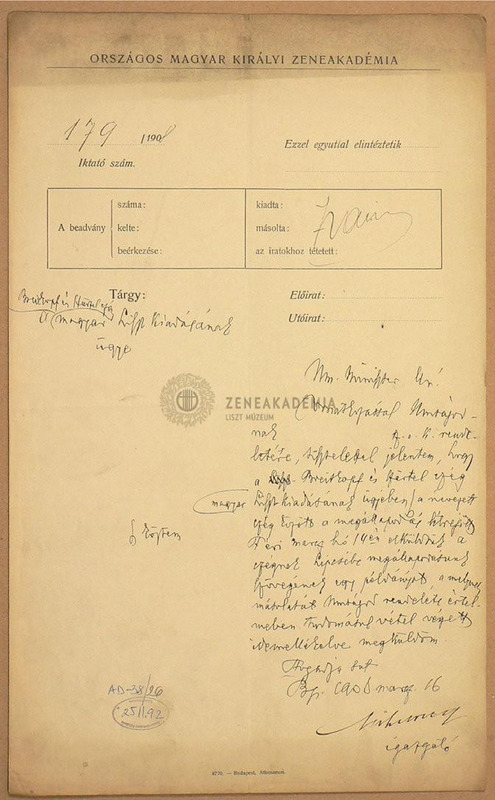 A Zeneakadémia igazgatója, Mihalovich Ödön értesíti a vallás-és közoktatási minisztert arról, hogy létrejött a megállapodás a Breitkopf és Härtel céggel a Liszt-összkiadás nyomtatása ügyében.