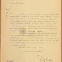 A vallás-és közoktatási minisztérium levele a Zeneakadémia igazgatóságának a Liszt-összkiadással kapcsolatban. Mivel a lipcsei Kahnt-féle cég a már kiadott Liszt-művek kiadását nem hajlandó átengedni a Breitkopf és Härtel cégnek, ezért felkéri az igazgatóságot, hogy az ügyben intézkedjen.