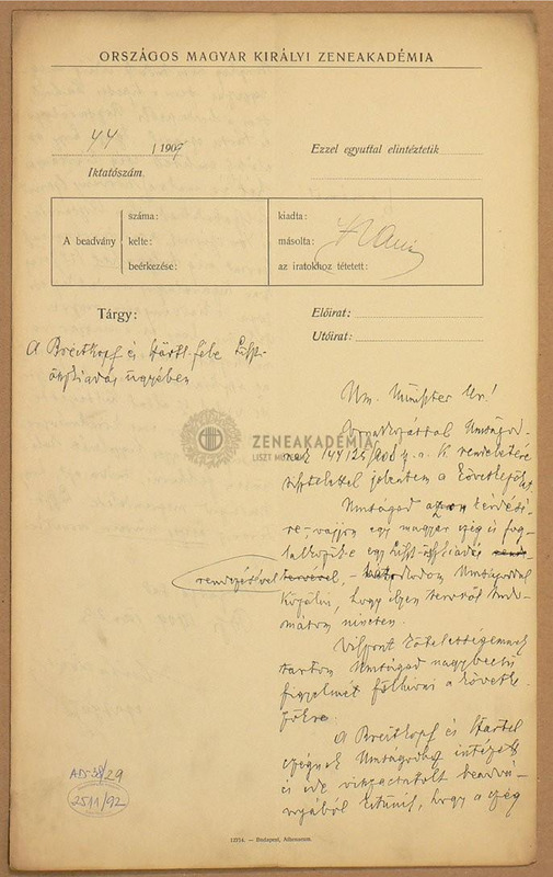 A Zeneakadémia igazgatója, Mihalovich Ödön kézírásos beadványa a vallás-és közoktatási minisztériumnak a Liszt-összkiadás ügyében, melyben tudatja, hogy idáig még sem a lipcsei Kahnt, sem a budapesti Rózsavölgyi céggel nem tudott megállapodni a Liszt-művek kiadási jogával kapcsolatban, viszont ezek két év múlva a törvény szerint elévülnek.