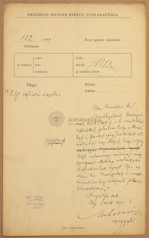 Mihalovich Ödön,a Zeneakadémia igazgatójának beadványa a vallás-és közoktatási miniszternek arról, hogy a Breitkopf és Härtel cégnek sikerült megszerezni a Liszt-művek kiadási jogát a Liszt-összkiadáshoz.