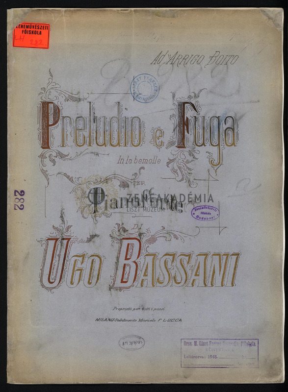 A szerző Lisztnek szóló kézírásos ajánlásával: "A Francesco Liszt/tanto nomini nullum par elogium [?]/riverente offre/Venezia, Settembre 1879./Ugo Bassani".