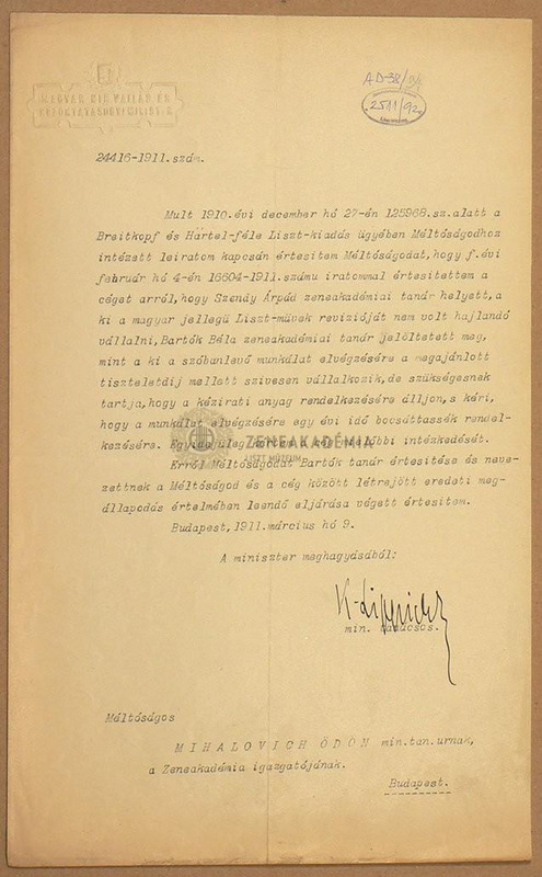 A miniszter megbízásából a minisztertanácsos levele Mihalovich Ödönnek,a Zeneakadémia igazgatójának arról, hogy a magyar jellegű Liszt-művek revízióját Szendy Árpád zeneakadémiai tanár helyett Bartók Béla fogja elvégezni,aki erre egy évet kért s az anyagok mielőbbi megtekintésének lehetőségét.