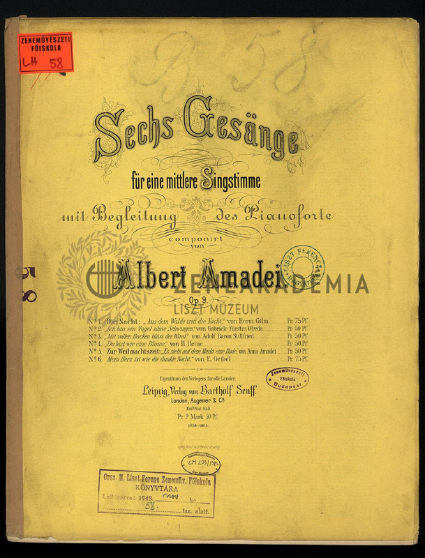 No. 1. Die Nacht (von Hermann Gilm); No. 2. "Ich bin ein Vogel ohne Schwingen" (von Gabriele Fürstin Wrede); No. 3. "Mit vollen Backen bläst der Wind" (von Adolf Baron Stillfried); No. 4. "Du bist wie eine Blume" (von H. Heine); No. 5. Zur Weihnachtszeit (von Anna Amadei); No. 6. "Mein Herz ist wie die dunkle Nacht" (von E. Geibel).
