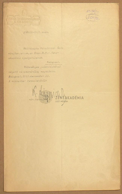 A minisztertanácsos értesítése a vallás-és közoktatási miniszter rendeletére Mihalovich Ödönnek, a Zeneakadémia igazgatójának, melyben véleményes jelentést kér a Breitkopf és Härtel-féle Liszt-összkiadással kapcsolatban.