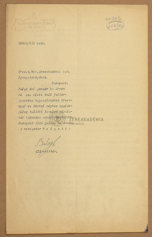 Balogh államtitkár értesítése a Zeneakadémia igazgatóságának arról, hogy a Breitkopf és Härtel céghez küldött levelének másolatát elküldi. A levél mellékelve.