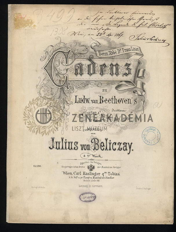 Lisztnek szóló kézírásos és nyomtatott ajánlással: "In dankbarer Erinnerung/ an den hohen künstlerischen Genuß/ den mir "die Legende der heil. Elisabeth"/ verursachte./ Wien, am 22t Apr. 1867. /Julius v. Beliczay."