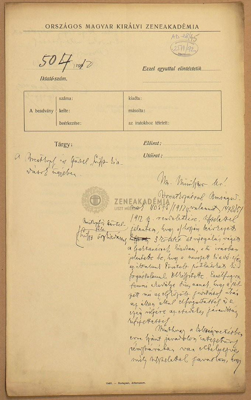 Mihalovich Ödön, a Zeneakadémia igazgatójának beadványa a vallás-és közoktatási miniszternek arról, hogy a Breikopf és Härtel cég által küldött Liszt-összkiadás 3 kötetét a kért szempontok alapján annak magyar nemzeti jellege érdekében kijavították, így átutalhatják a cégnek az esedékes részletet.