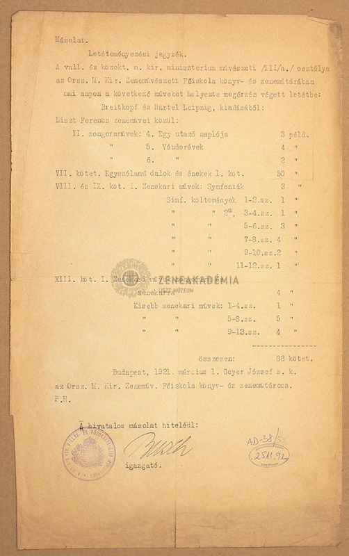 Letéteményezési jegyzék másolata a Breitkopf és Härtel cég által kiadott Liszt-összkiadás köteteinek felsorolásával, melyeket a vallás-és közoktatási minisztérium a Zeneakadémia könyv-és zeneműtárában megőrzésre elhelyezett.Geyer József, a Zeneakadémia könyv-és zeneműtárosának aláírásával.