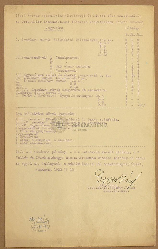 A Zeneakadémia könyv-és zeneműtárának jegyzéke a lipcsei Breitkopf és Härtel cég által készített Liszt-összkiadás általuk őrzött köteteiről. Geyer József, könyv-és zeneműtáros aláírásával.
