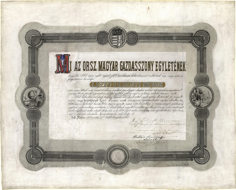 Az Országos Magyar Gazdasszony Egylet díszoklevele Liszt örökös alapító tagságáról, az árvalány-nevelde pénzalapjához való hozzájárulásának emlékére, özv. Damjanich János egyleti elnök, Hollán Ernőné alelnök és Braun Lajosné alelnök aláírásával.