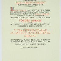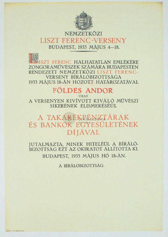 Díszoklevél a Takarékpénztárak és Bankok Egyesületének díjával jutalmazott Földes Andor részére az 1933-as Nemzetközi Liszt Zongoraversenyről.