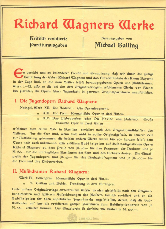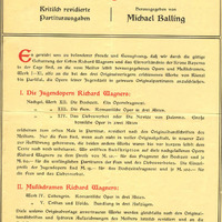 A Breitkopf és Härtel cég előszava Wagner zenedrámáinak, ifj.úkori operáinak és zenei műveinek Michael Balling által készített revideált, kritikai partitúra-kiadásához. Az egyes kötetek tartalmának ismertetése rövid leírással. Pontos keltezés nem látható.1912. húsvétja szerepel dátumként.