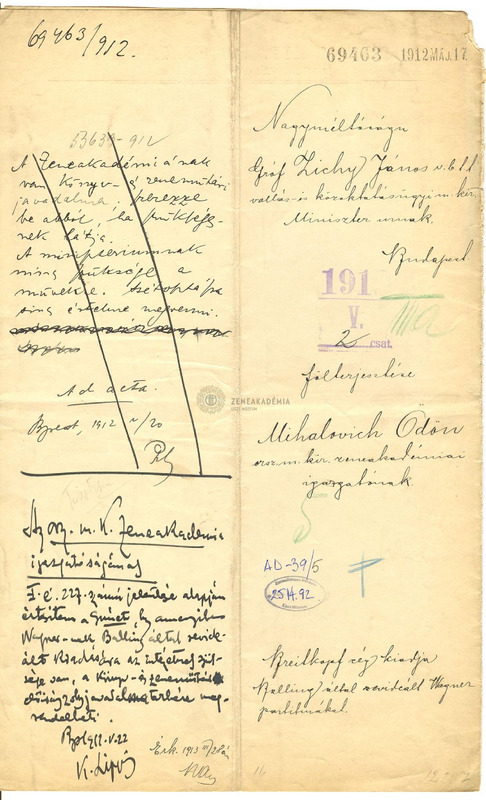 Mihalovich Ödön, a Zeneakadémia igazgatójának felterjesztése gróf Zichy János vallás-és közoktatási miniszternek a Balling által revideált Wagner-partitúrák kiadásának ügyében.Kézírásos. A dokumentum bal oldalán miniszteri rendelet a Zeneakadémia igazgatóságának, kézírással, 1912.05.22-én keltezve.