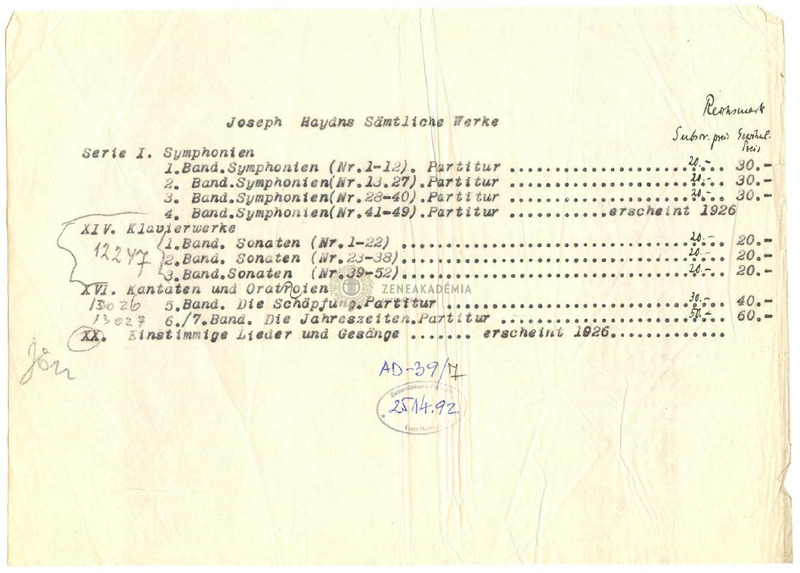 - Feljegyzés a lipcsei Breitkopf és Härtel cég Haydn-összkiadásáról,a kötetek címével, az előfizetők számával (kézírásos) és az előfizetői díjjal.