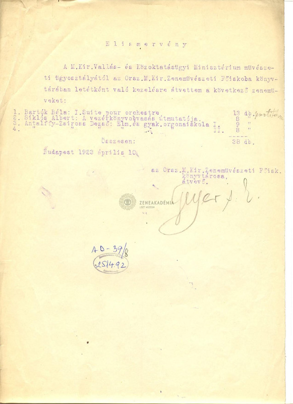 A Zeneakadémia elismervénye a vallás-és közoktatási minisztériumnak arról, hogy könyvtárába a következő 4 kötetet letétként való kezelés céljából átvette: Bartók Béla: I. Suite pour orchestre, Siklós Albert: A vezérkönyvolvasás útmutatója, Antalffy-Zsiross Dezső: Elm.és gyak. orgonaiskola I-II. Geyer József könyvtáros aláírásával.