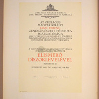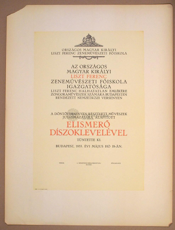 A Liszt Ferenc Zeneművészeti Főiskola igazgatósága az 1933-as Nemzetközi Liszt Zongoraverseny döntőjében résztvevőket jutalmazó elismerő díszoklevél.