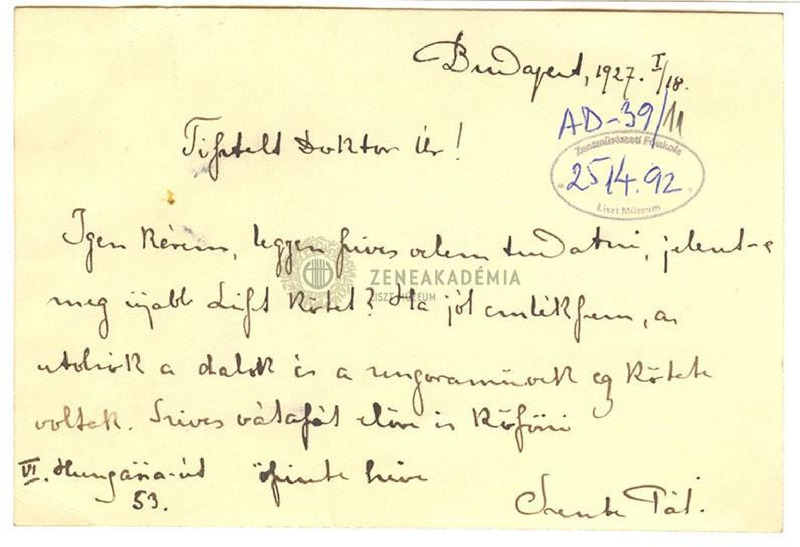 - Szente Pál országos szakfelügyelő levele, melyben érdeklődik, hogy megjelent-e a Liszt-összkiadás újabb kötete.