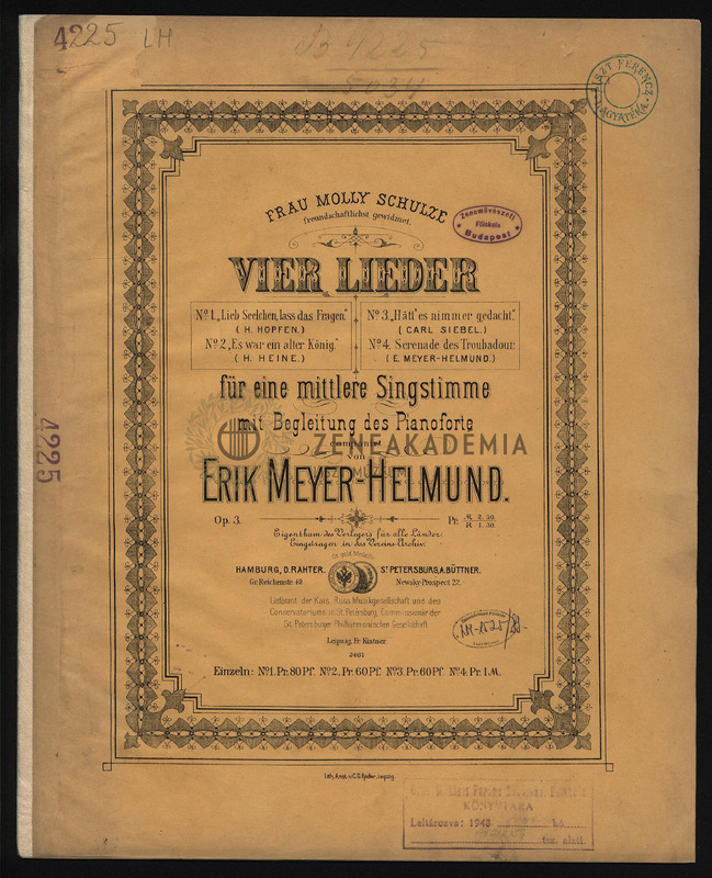 No. 1. "Lieb Seelchen, lass das Fragen." (H. Hopfen); No. 2. "Es war ein alter König." (H. Heine); No. 3. "Hättes nimmer gedacht."(Carl Siebel); No. 4. Serenade des Troubadour. (E. Meyer-Helmund).
