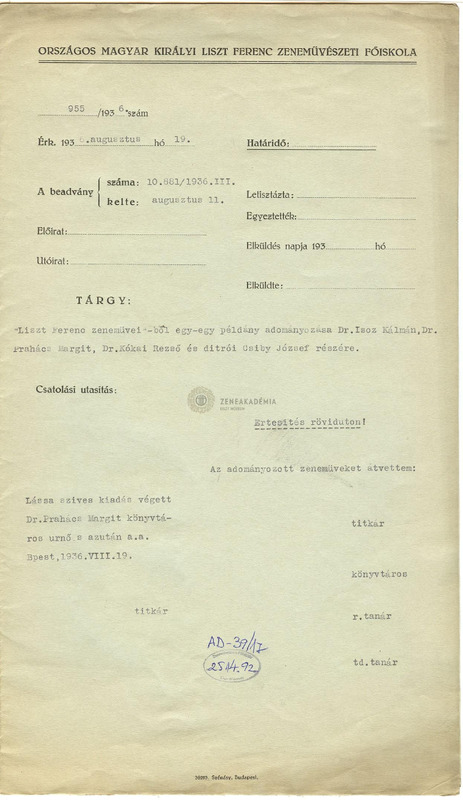 A Zeneakadémia beadványa arról, hogy miniszteri rendelet alapján Dr. Isoz Kálmánnak, Dr.Prahács Margitnak, Dr. Kókai Rezsőnek és ditrói Csiby Józsefnek a Liszt-összkiadás egy-egy példányát adományozzák.