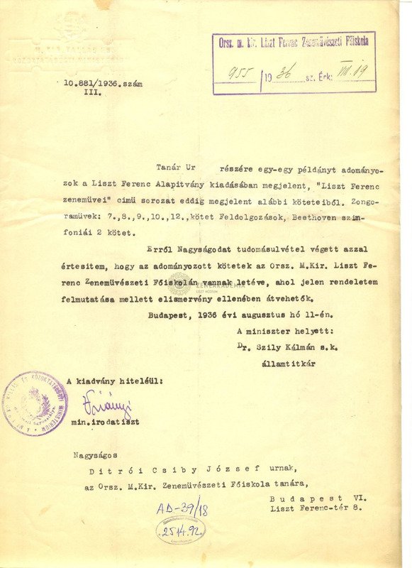 Dr.Szily Kálmán értesítése a miniszteri rendeletről, mely ditrói Csiby József zeneakadémiai tanárnak adományozza a Liszt -összkiadás alábbi köteteit: Zongoraművek:7,8,9,10,12.; Feldolgozások, Beethoven szimfóniái 2. kötetét.