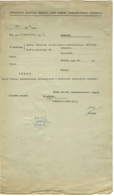A Zeneakadémia beadványa arról, hogy a vallás-és közoktatási minisztérium Liszt zeneműveit adományozza a debreceni zeneiskolának, Isoz Kálmán zeneakadémiai titkár aláírásával.