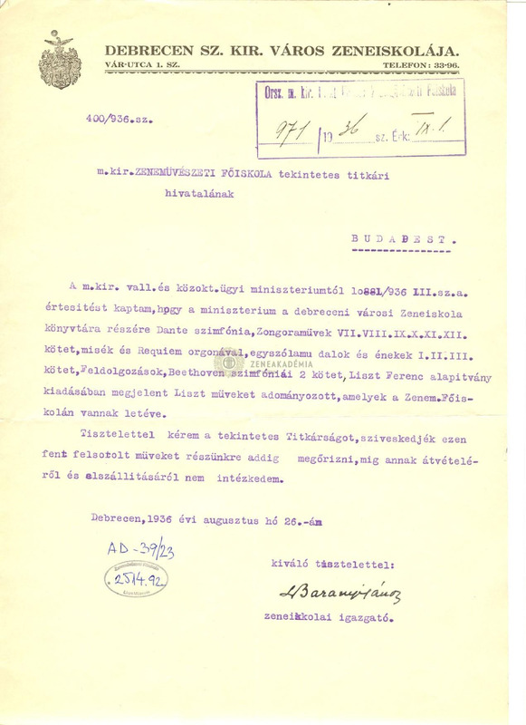 A debreceni zeneiskola igazgatójának levele a Zeneakadémia titkári hivatalának. Kéri, hogy a vallás-és közoktatási minisztériumi rendelet alapján a Liszt-összkiadás iskolának adományozott köteteit őrizzék meg, míg elszállításukról nem gondoskodik.