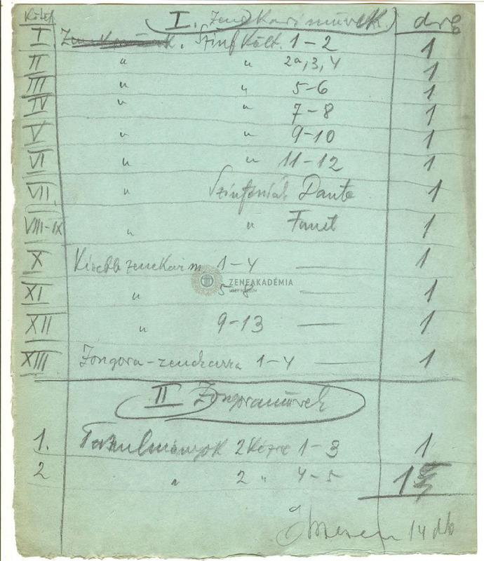 - Kézzel írt feljegyzés a Liszt-összkiadás 14 kötetéről. Keltezés nincs.