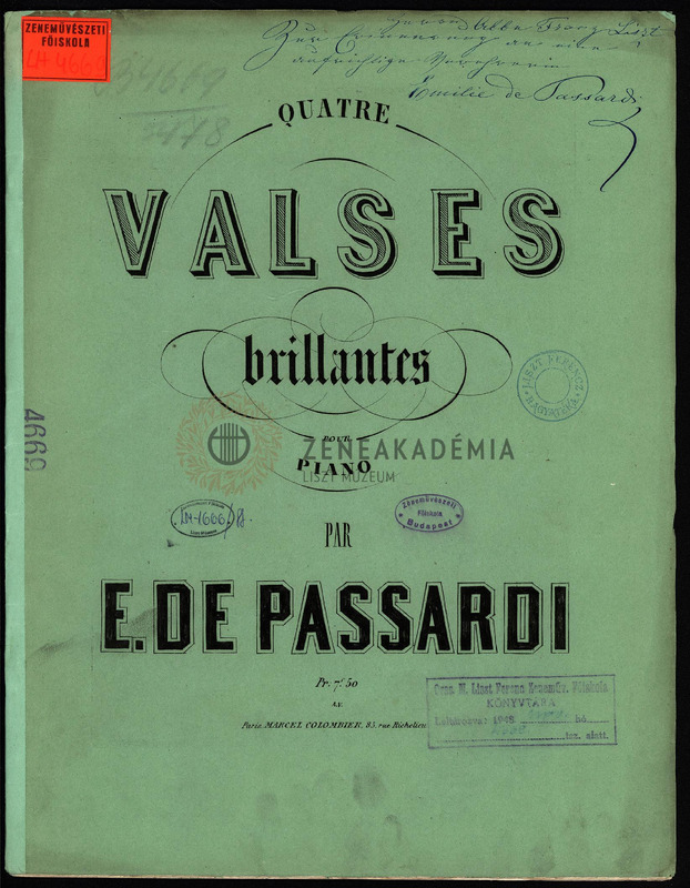 A szerző Lisztnek szóló kézírásos ajánlásával: "Herrn Abbe Franz Liszt Zur Erinnerung an eine aufrichtige Verehrerin Emilie de Passardi."