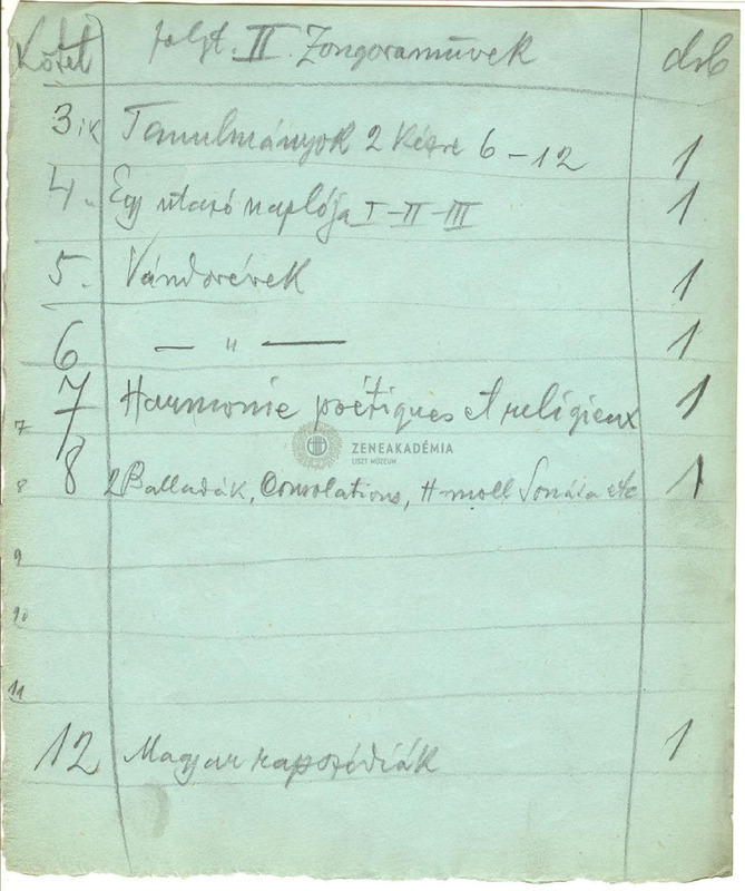 - Kézzel írt feljegyzés a Liszt-összkiadás 7 kötetéről. Keltezés nincs.