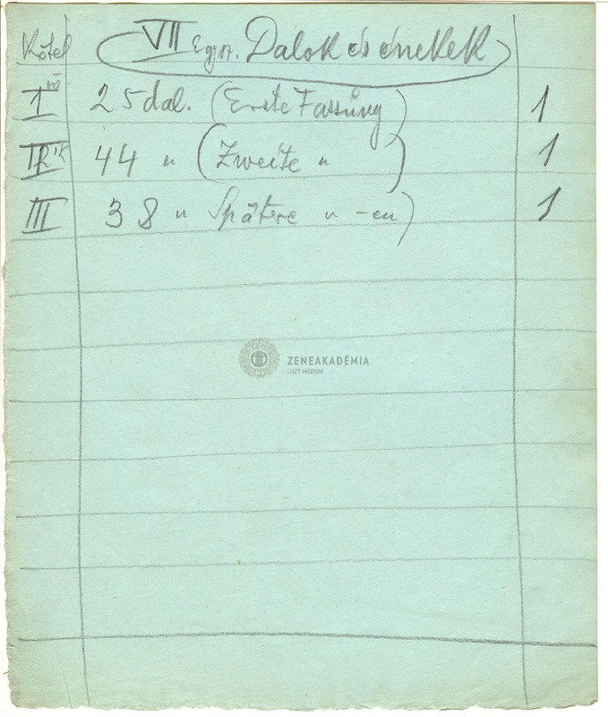 - Kézzel írt feljegyzés a Liszt-összkiadás "Dalok és énekek" 3 kötetéről. Keltezés nincs.