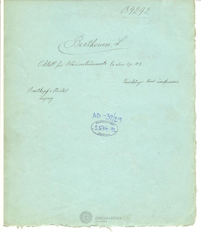 - Kézzel írt feljegyzés a következő felirattal: Beethoven, "Oktett für Blasinstrumente Es dur op.103. "Breitkopf & Härtel, Leipzig. Keltezés nincs.