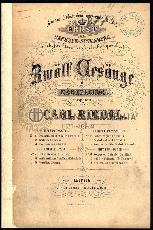 Heft I. No. 1. Deutschland über Alles (Kinkel); No. 2. Reiterlied (Lenau); No. 3. Todesahnung (Kinkel). Heft II. No. 4. Reiters-Angriff (Schultes); No. 5. Schlachtenlied (Arndt); No. 6. Abendlied nach der Schlacht (Kinkel). Heft III. No. 7. Schlachtenlied II (Arndt); No. 8. Waffenstillstand bei Nacht (Eichendorff); No. 9. Reiterlied (Körner). Heft IV. No. 10. Vorposten-Gefecht (Pechlin); No. 11. Auf der Wahlstatt (Hoffmann v. F.); No. 12. Husarenlied (Hoffmann v. F.).