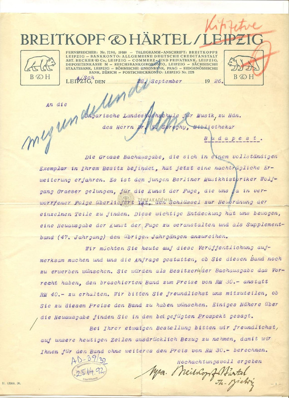 A lipcsei Breitkopf és Härtel cég levele Dr.Sereghy Elemérnek, a Zeneakadémia könyvtárosának az általuk megjelentetett Bach-összkiadásról és annak kiegészítő kötetéről s áráról.