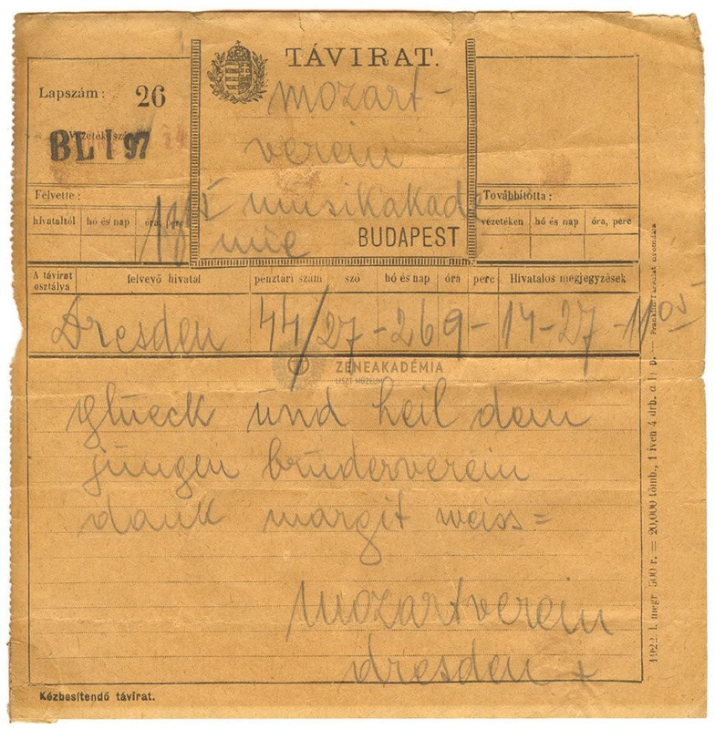 - Távirat Margit Weiss aláírásával, Mozartverein Dresdau Musikakademie címzéssel.