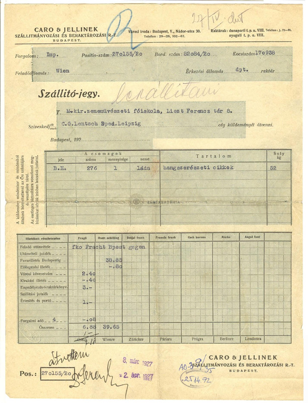 - 1927.03.08-án kelt szállítójegy a lipcsei C.G. Lentsch Sped. által a Zeneakadémiának küldött hangszerészeti cikkekről.Az átvétel időpontja: 1927.04.02.