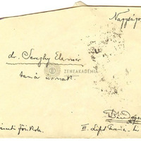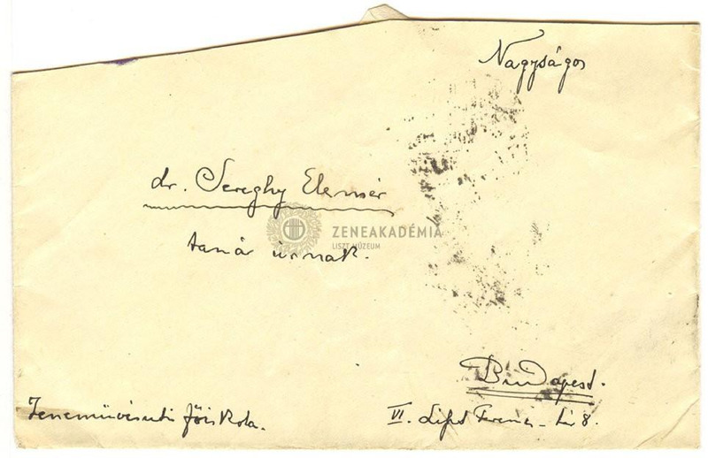 - Dr. Sereghy Elemérnek, a Zeneakadémia könyvtárosának írott levél borítéka. Hátoldalán kéziratos feljegyzés a Liszt-összkiadás egyes köteteiről.