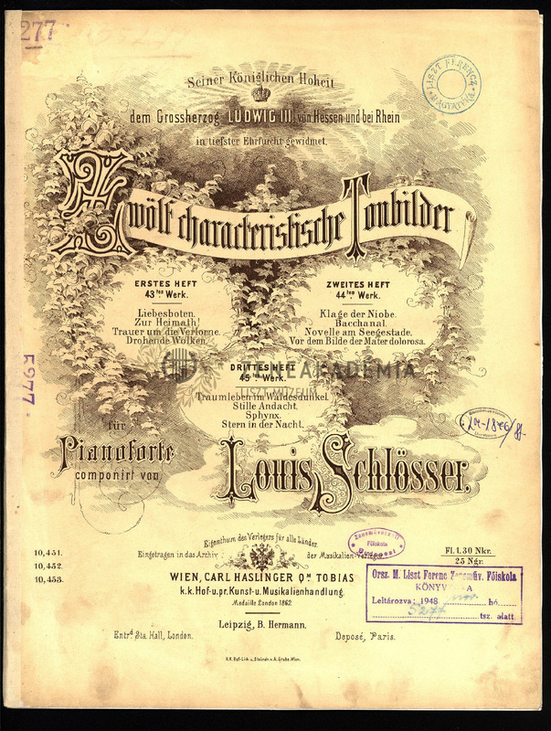 Erstes Heft, 43tes Werk: Liebesboten; Zur Heimath!; Trauer um die Verlorne; Drohende Wolken. Zweites Heft, 44tes Werk: Klage der Niobe; Bacchanal; Novelle am Seegestade; Vor dem Bilde der Mater Dolorosa. Drittes Heft, 45tes Werk: Traumleben im Waldesdunkel; Stille Andacht; Sphynx; Stern in der Nacht.