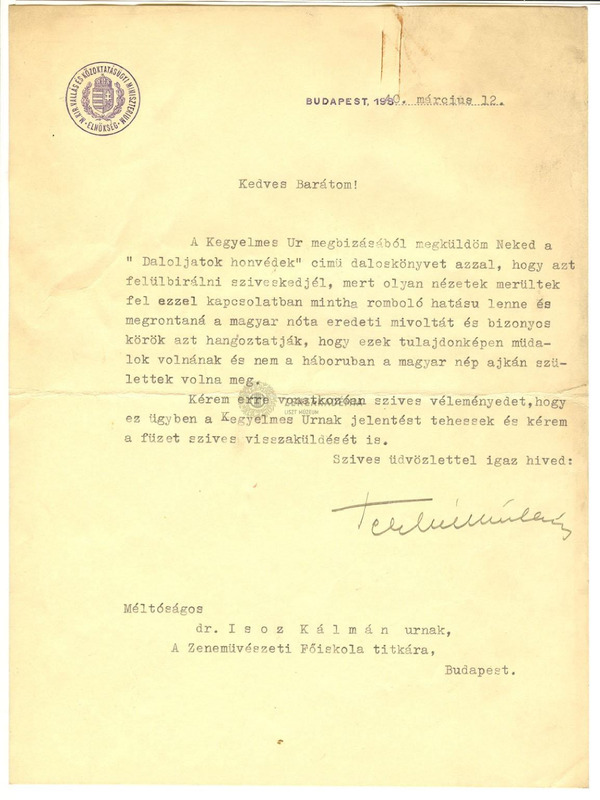 Levél dr. Isoz Kálmánnak, a Zeneakadémia titkárának a "Daloljatok, honvédek" c. daloskönyv bírálata céljából, mivel kétségek merültek fel a dalok eredeti, népi mivoltával kapcsolatban.