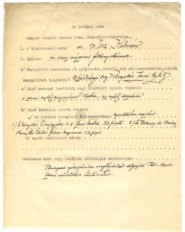 Dr. Isoz Kálmánra, a Magyar Nemzeti Múzeum főkönyvtárnokára, a zenei osztály vezetőjére vonatkozó részletes kérdőív, a hozzáragasztott papírlapon munkásságának leírása.Keltezés nem látható.
