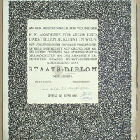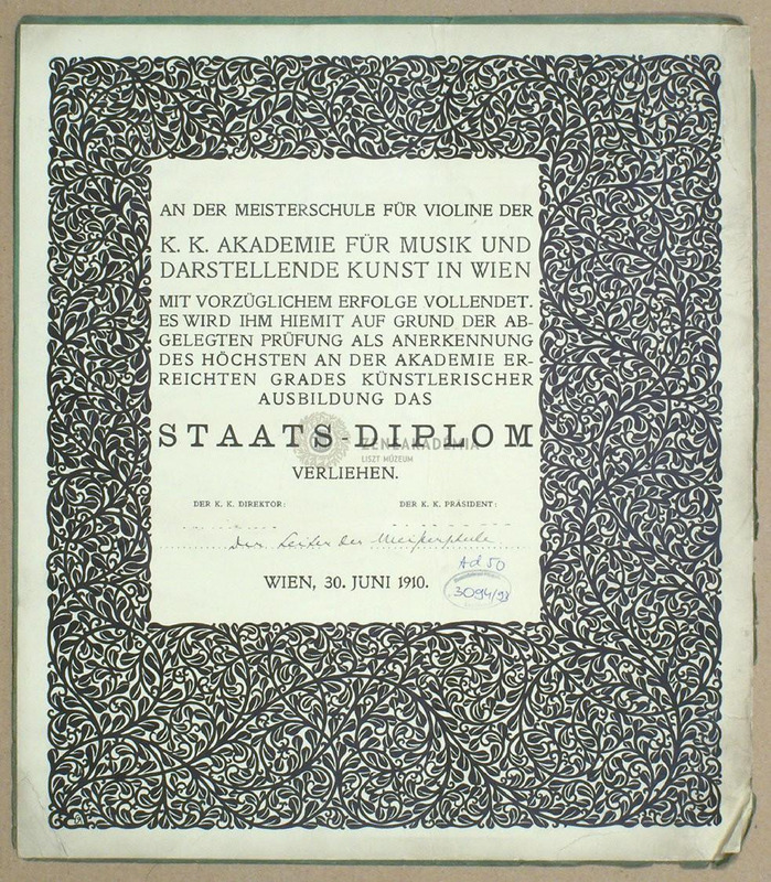 - A Bécsi Császári és Királyi Zene-és Képzőművészeti Akadémia hegedű mester-iskolájának oklevele.