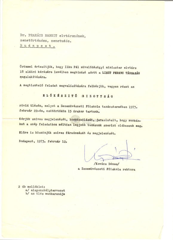 Kovács Dénesnek, a Zeneművészeti Főiskola rektorának a levele Dr. Prahács Margit zenetörténészhez, zenetudóshoz, melyben meghívja az Ilku Pál művelődésügyi miniszter megbízásából létrejött Liszt Ferenc Társaság előkészítő bizottságának ülésére.