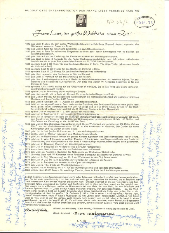 A Raiding-i (doborjáni) Liszt Ferenc Egyesület feljegyzése a Liszt által adott jótékonysági koncertekról, "Liszt Ferenc, korának legnagyobb jótevője!" címmel. Rudolf Otte Liszt-kutató és az egyesület tagjának munkája.Keltezés nincs.
