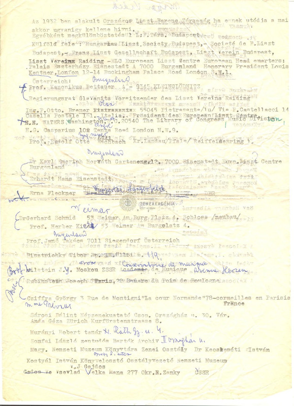 - A Liszt Ferenc Társaság magyar és külföldön élő tagjainak címlistája. Keltezés nincs.