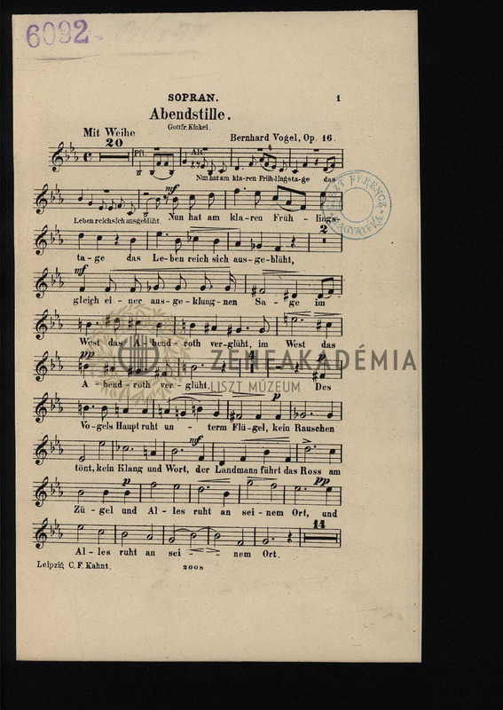 Abendstille, Elegischer Gesang für gemischten Chor mit Begleitung des Pianoforte. Op. 16. Klavierauszug und Stimmen.